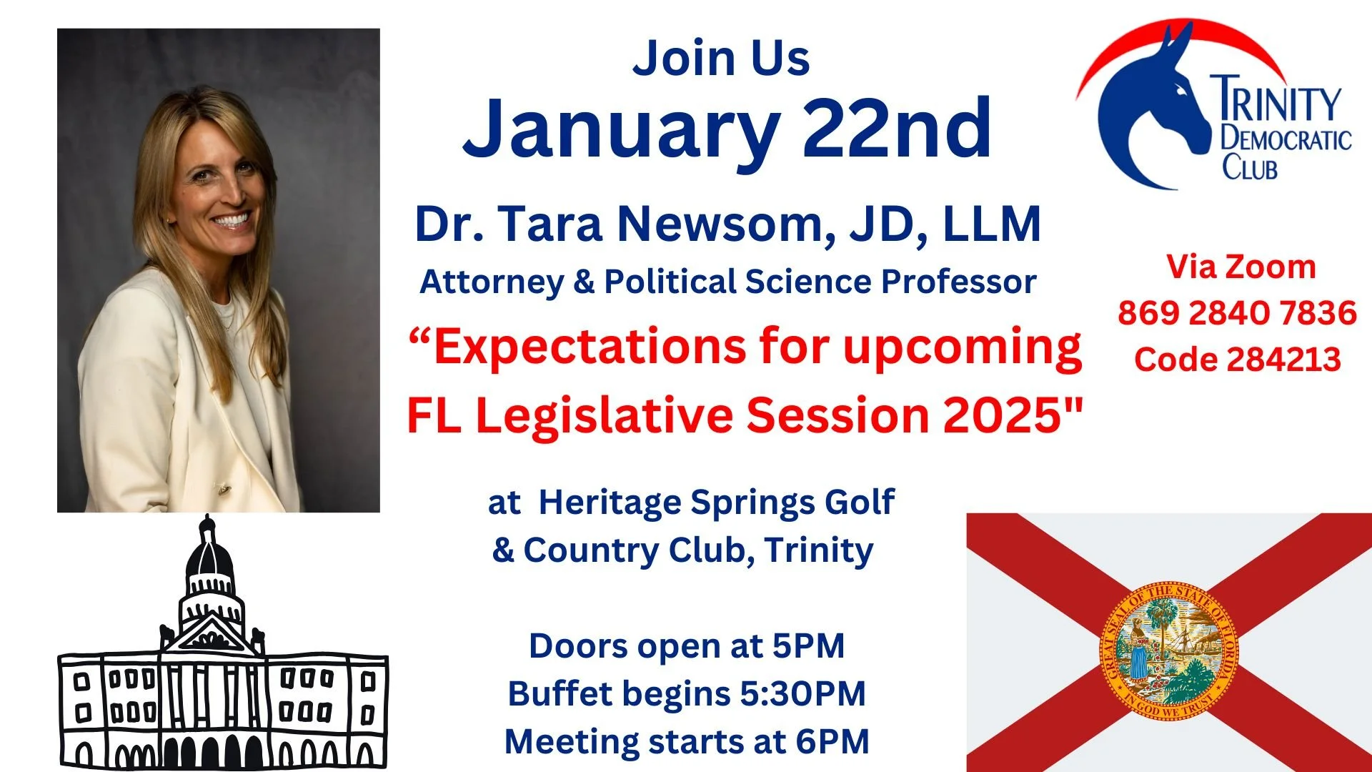Join us for our monthly meetings at Heritage Springs Banquet Room. Our keynote speaker this month will be Dr. Tara Newsom. Dr. Newsom will discus the upcoming Florida legislative session. We will also be nominating officers and board members during this meeting. Please consider joining our leadership and being an active part of the change forward. We look forward to seeing you all there!